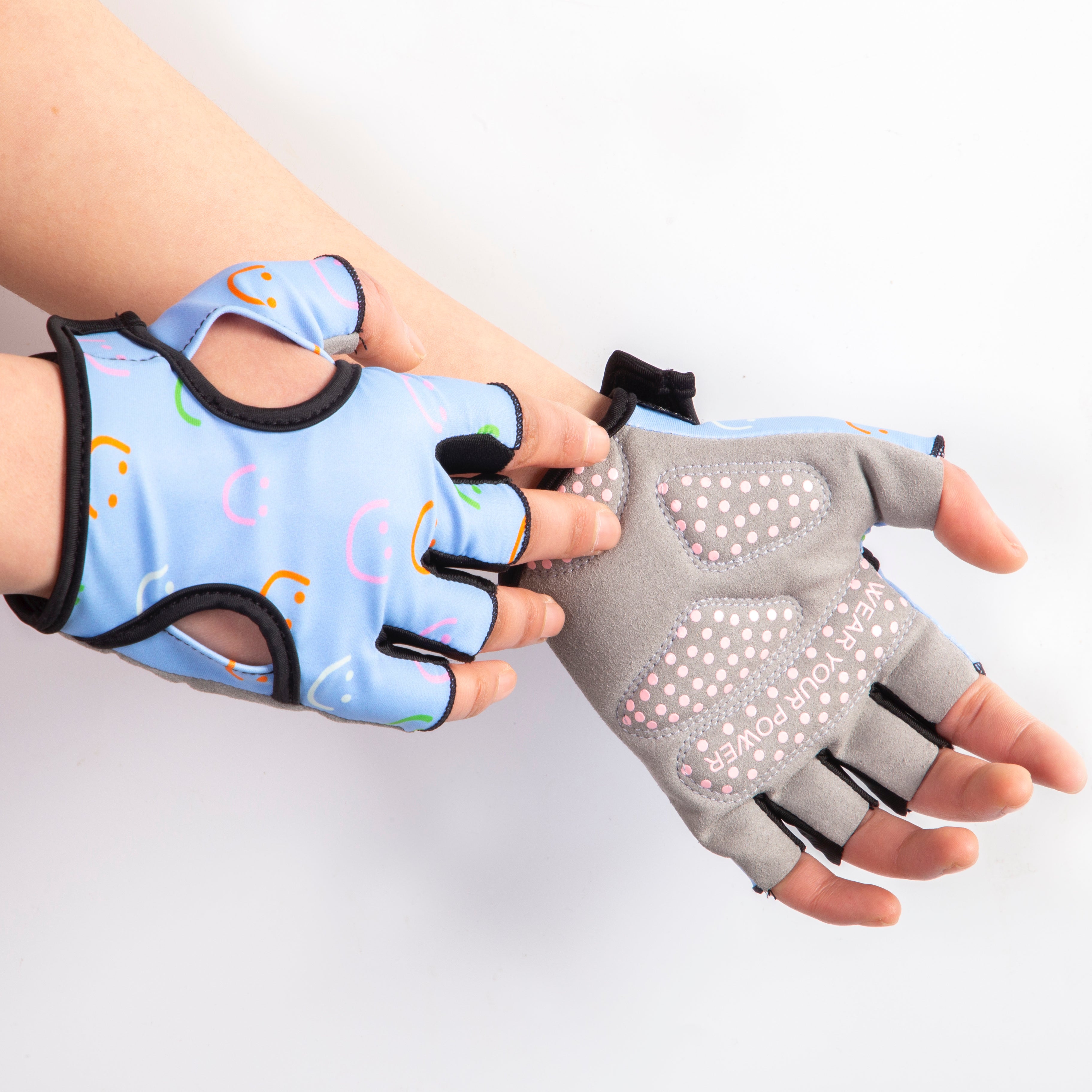 - FASHION + FUNCTIONALITY – The Smile On workout gloves are designed to provide support and protection. The combination of a cool sky blue with smiley faces make these gloves embody fun and functionality.